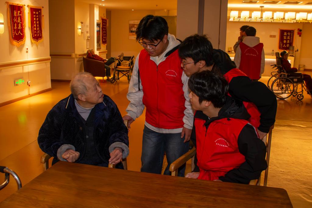 活动中,志愿者们分组陪伴老人,营造了温馨融洽的氛围。棋桌旁,同学们静静观战,认真聆听老人复盘讲解,不时赞叹“爷爷这步走得妙”,让老人在对弈中感受到更多乐趣。走廊和休息室内,大家围坐在一起,亲切地与老人拉家常,耐心倾听他们讲述往事,原本安静的空间洋溢着欢声笑语。志愿者们还主动穿梭于各个区域,细心询问“您需要喝水吗”,并熟练地为老人添上温水,双手递到他们手中,举手投足间尽显关怀。